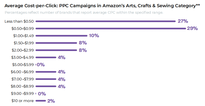 艺术、工艺和缝纫品类的广告成本相对较低,近60%的品牌CPC低于1.5美元,但部分高端子类别的CPC超过5美元。4%的亚马逊卖家将该品类列为主要产品类别,销量同比增长14%,收入增长13%,但增速仍落后于增长最快的市场近70%。